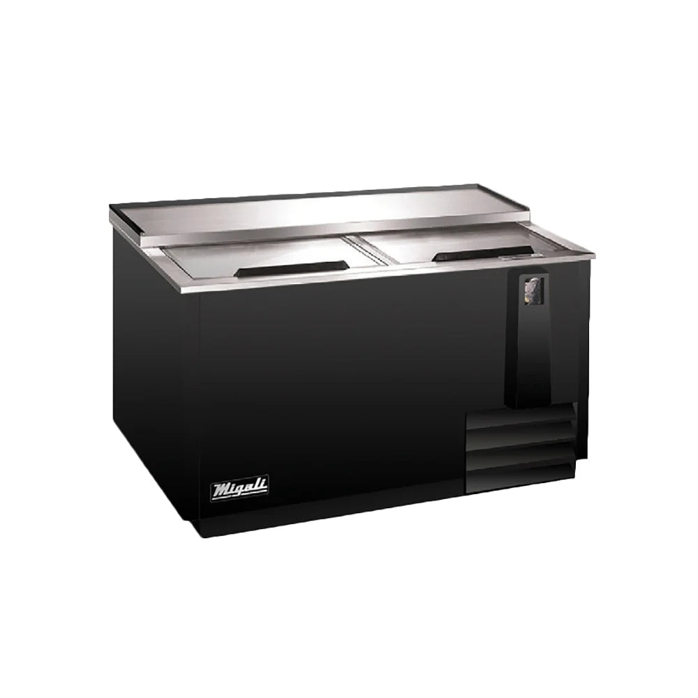 The Migali C-HBC65-HC bottle cooler holds cases of bottles and cans at cold temperatures so bars can satisfy customer demand for an authentic beer experience. Providing a convenient way to speed up service, a bottle opener and cap catcher are built into the cooler's front panel. While the top and interior are stainless steel, the unit's exterior is made of black laminated steel.