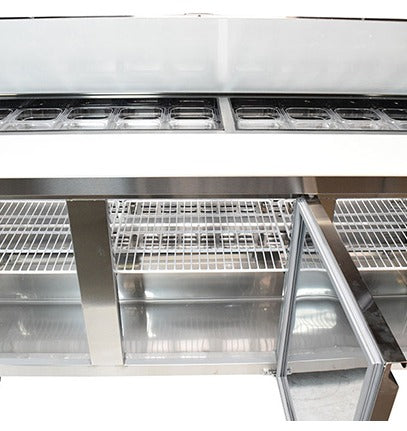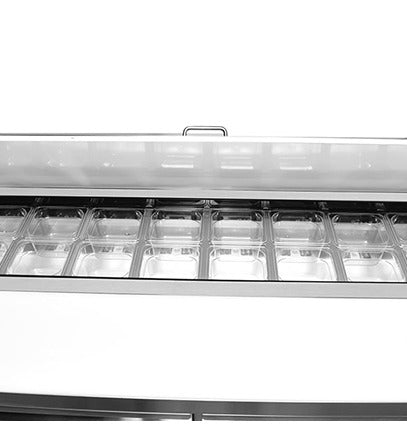 Saba Corpusa SPS-72-30M Mega-Top Sandwich/Salad prep table is designed to provide maximum ingredient storage and prep efficiency without taking up extra floor space. Perfect for any size kitchen, this elegant unit features a durable stainless steel interior and exterior with an aluminum finished back for long-lasting performance and easy sanitation.